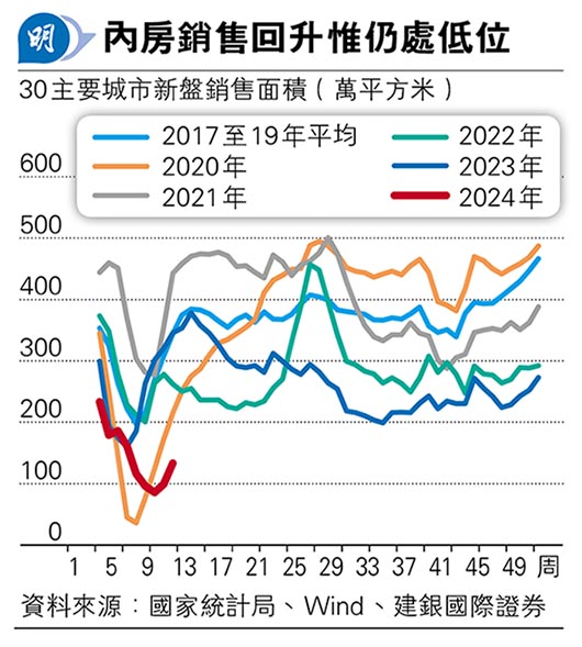 【明報專訊】根據建銀國際證券本周一發表的研究報告,即使最近一周內地30個主要城市新建商品房銷售面積按周回升,但這只是季節因素,而按年比較仍錄得可觀跌幅(見圖)。