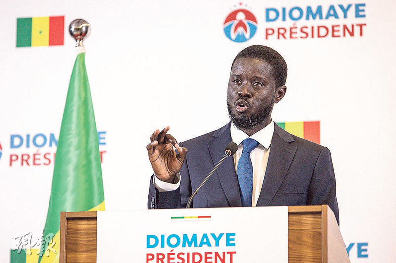【明報專訊】西非塞內加爾周日舉行總統選舉第一輪投票,綽號「廉潔先生」(Mr Clean)的「迪奧馬耶總統」聯盟反建制候選人法耶(Bassirou Diomaye Faye)初步得票超過五成,拋離其最大競選對手執政聯盟候選人阿馬杜‧巴(Amadou Ba)起碼17個百分點。周一(25日)滿44歲的法耶已獲現任總統薩勒及阿馬杜‧巴祝賀獲勝,將成為該國最年輕總統。