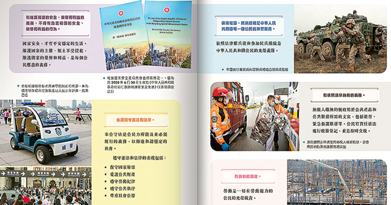 各課本均設獨立章節講述作為香港居民的權利與義務,強調「行使權利非全無限制」。當中教圖《探索.慎思.明辨》有7頁講述權利與責任間平衡和取捨,達該章節近半(46.7%)內容,佔比多於其他課本,舉例行使遊行自由時「不得損害他人使用道路的權利」、「須先獲不反對通知書」。