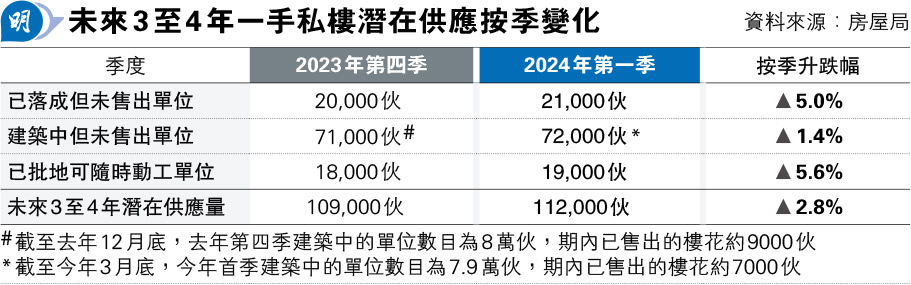 【明報專訊】受今年初「撤辣」前淡市影響,新盤銷情放緩,據房屋局最新公布,截至今年3月底,未來3至4年一手私樓供應料達11.2萬伙,按季多3000伙或2.7%,連續兩季創新高,其中已落成但未售出單位,按季多1000伙,增至2.1萬伙,再創歷史新高,而期內建築中單位雖然按季減少1000伙至7.9萬伙,但已預售單位卻由去年第四季的9000伙跌至今年首季的7000伙,按季少2000伙,令建築中但未售出之單位增至7.2萬伙,按季多1000伙,同創歷史新高。