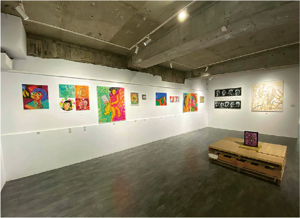 展覽地點位於高雄前金區的正旅館地庫,是一個無窗的空間,地庫微涼的溫度襯托着揸兜的主題氣氛,數十幅作品掛在牆壁上,有些則似是隨意地擺放在角落與地上,牆壁上也有大大小小不算工整的親筆手寫字,腦海出現的是從前於香港街頭可見的九龍皇帝曾灶財街頭塗鴉,猶如帶我重回香港的街頭。作品充滿香港特色,其一讓我感到深刻的是4幅正方形「門系列」的粗口字,作品上把「小」、「西」、「九」、「七」、「能」從「門」中強行扯開,然後放大、縮小、搓圓、撳扁,字不再是本身字的形態,而是把字當成圖畫看待,不像中國書法般追求線條的美,反而從形態的扭曲滲出藏在字底下的激情。