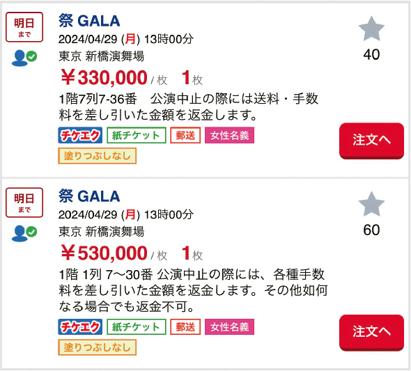 說回遲了1.5小時開演的舞台劇,發生問題的是第一行的正中間區域,跟舞台相距僅1.5米。也是所謂能看到毛孔、聞到體香,甚至能被演員汗水灑中的天價座席。有多天價呢?查看4月29日最後一場公演,黃牛把同樣區域炒至53萬円,按最近超低匯率結算為港元26,000。即使最後一場價格會被抬高,4月中的演出也大概需要二三十萬円。
