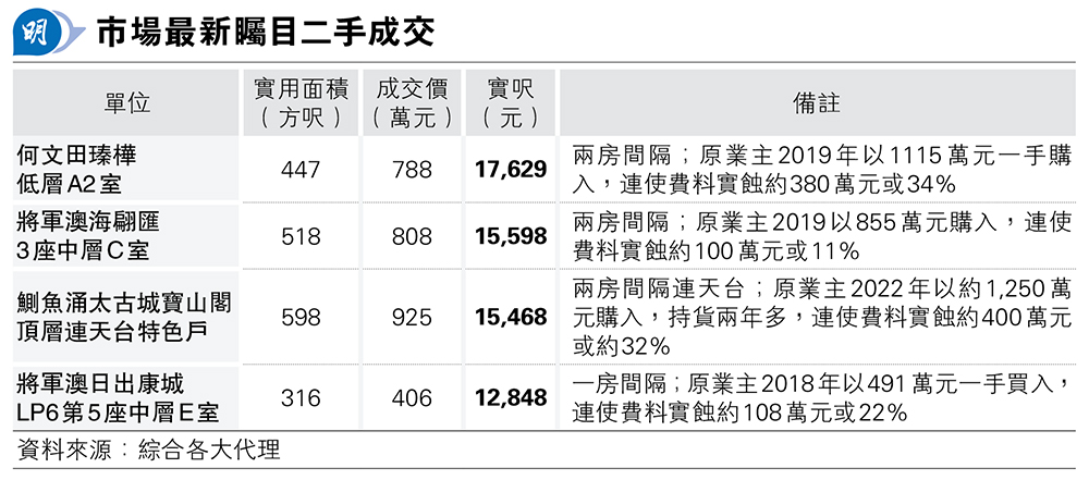 與此同時,新晉屋苑亦不乏二手蝕讓。香港置業首席分區董事劉浩勤表示,將軍澳海翩匯第3座中層C室,實用面積518方呎兩房間隔,新近以808萬元易手、實呎15,598元,雖然屬市價,惟原業主2019以855萬元購入,帳面蝕約47萬元或5.5%,連同各項使費有機會實蝕約100萬元或11%。