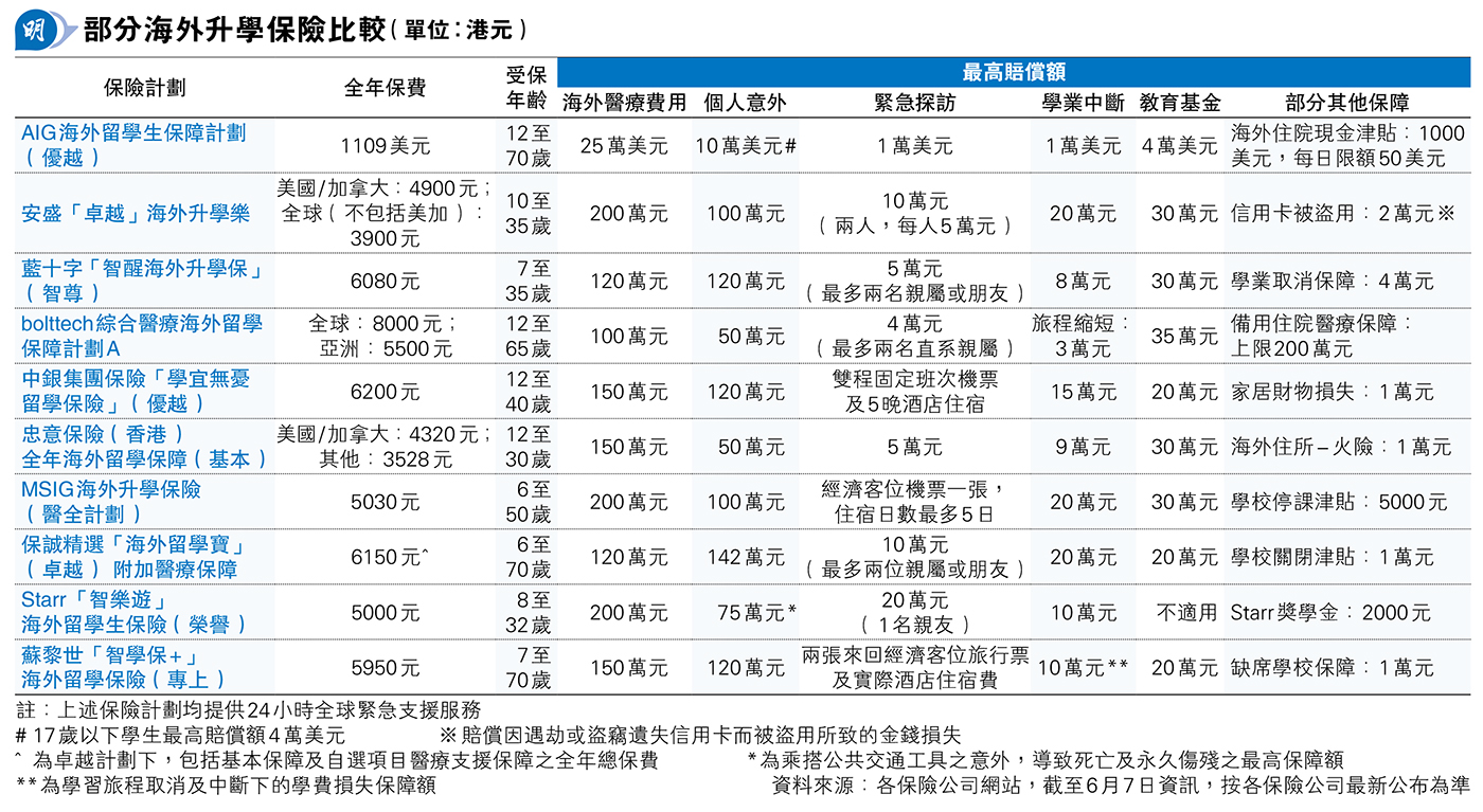 【明報專訊】甫踏入6月,不少父母已積極為將於9月遠赴海外升學的子女,作最後階段準備。留學期間的意外難料,即使已為子女購買當地醫保,父母不妨考慮為子女多買一份海外升學保險,加強子女於外地患病或受傷時的醫療保障,並為子女提供多一個支援渠道。