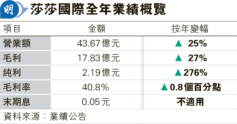 莎莎年內營業額為43.67億元,按年升25%。毛利為17.83億元,按年升27%。毛利率為40.8%,按年升0.8個百分點。港澳地區營業額為34.1億元,按年升31%。郭少明表示,去年1月港澳地區與中國內地恢復通關,並出現「報復性消費」刺激業務增長。
