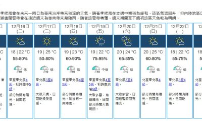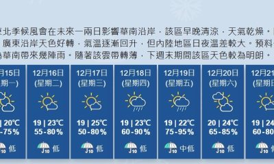 本港地區今晚及明日(14日)大致多雲,有幾陣驟雨,最低氣溫約28°C。日間部分時間有陽光及酷熱,最高氣溫約34°C。吹和緩偏南風,明日轉吹東至東南風,稍後離岸風勢間中清勁。展望隨後兩三日短暫時間有陽光,驟雨逐漸增多。