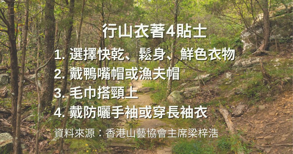 1. 選擇快乾、鬆身、鮮色衣物——建議穿混合人工纖維衣服,通常較透氣和快乾;