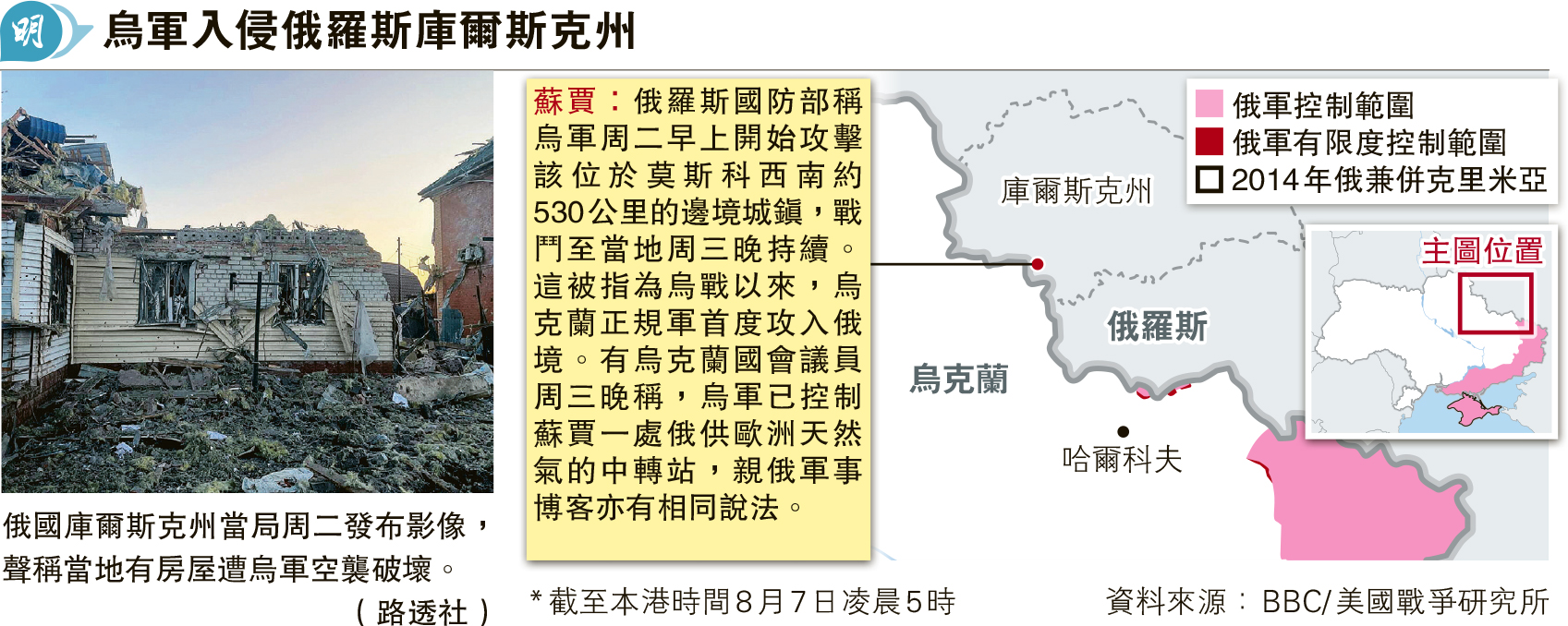 烏克蘭昨首度承認進入庫州。總統澤連斯基的高級助手波多利亞克昨表示:包括進入庫爾斯克在內的任何升級,根本原因在於俄羅斯的「明目張膽侵略」,「以為入侵烏克蘭毋須承擔後果」。
