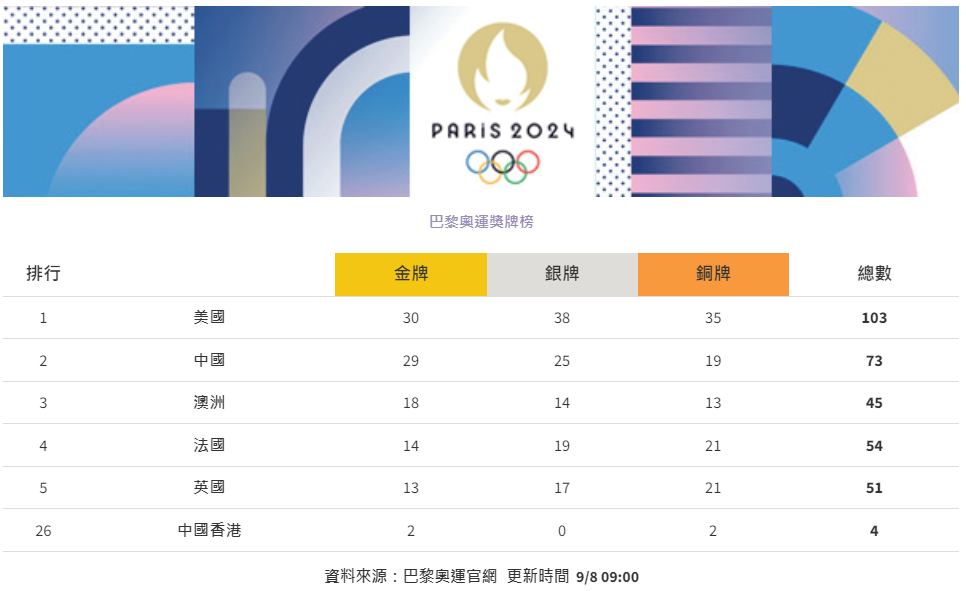 即時熱點 巴黎奧運奬牌榜|國家隊添一金兩銅 奧運女子拳擊項目首次奪金 (09:04) 發佈於 1 年 前 2024 年 8 月 9 日 By 明報 【09:04】國家隊常園在拳擊女子54公斤級決賽中擊敗土耳其對手奪金,是國家隊在奧運女子拳擊項目上首面金牌。龐倩玉在摔跤女子自由式53公斤級銅牌賽中,擊敗蒙古選手摘銅。而在跆拳道男子68公斤級銅牌賽,由於英國選手因傷退賽,梁育帥自動獲銅牌。國家隊現累積29金25銀19銅,排奬牌榜第二位。 巴黎奧運專題報道:shorturl.at/zcQOH 國家隊相關報道:shorturl.at/dcOD3 港隊相關報道:shorturl.at/JVf7z 相關文章:shorturl.at/dcOD3shorturl.at/JVf7z奧運熱點奬牌榜巴黎奧運熱門HOTPICK編輯推介 Up Next 天氣|天文台:日間酷熱最高34°C 新界再高一兩度 (08:31) 不要錯過 巴黎奧運|8月9日焦點賽事 國乒男團爭五連冠 跳水陳藝文昌雅妮爭金 霹靂舞B-Girls亮相 (10:19) 繼續閱讀 贊助商 猜你喜歡 7-Eleven、華御結推12元飯糰優惠|著數情報 (19:00) 澳洲社交媒體禁令Q&A|周三起禁16歲以下用社媒 哪些平台被禁? 會否刪除帳號? (17:47) 澳洲社交媒體禁令Q&A|周三起禁16歲以下用社媒 哪些平台被禁? 會否刪除帳號? (17:47) 黑龍江撫遠馬拉松2026年元旦舉行 起終點設「鱘鰉魚火鍋」供跑手補給 (13:00) 短片:日本青森地震一刻 道路塌陷建築物損毁【多圖】 (11:13) 「亞洲飛人」蘇炳添宣布退役 「每個腳印有汗水淚水、遺憾榮耀,百感交集,更多是感恩」 (10:21)
