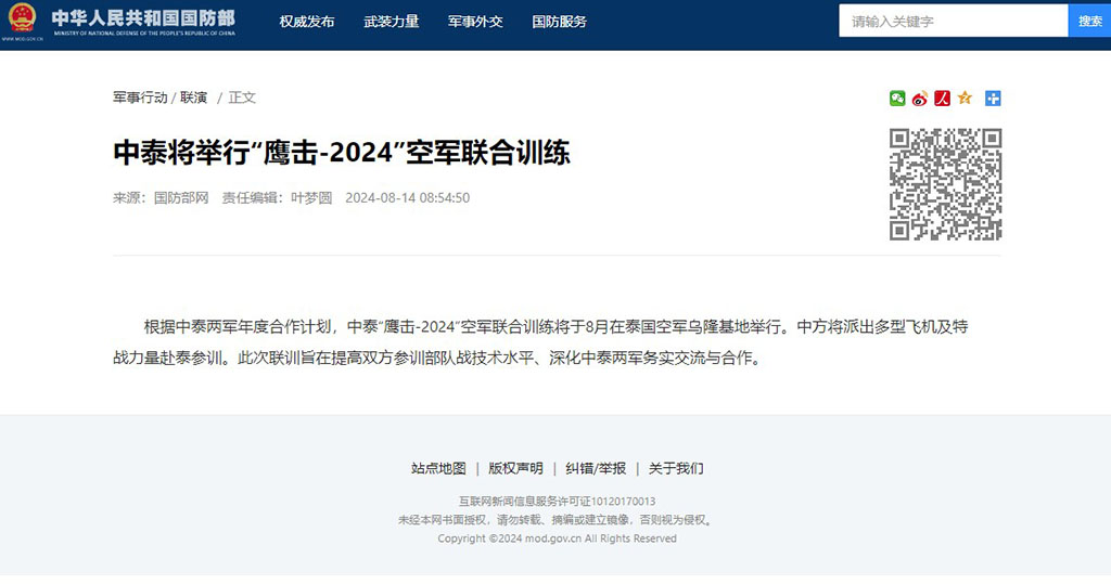 即時兩岸 中泰空軍聯合訓練 解放軍多型飛機赴泰 (14:54) 發佈於 1 年 前 2024 年 8 月 14 日 By 明報 中國國防部今天(14日)通報,根據中泰兩軍年度合作計劃,中泰「鷹擊-2024」空軍聯合訓練將於8月在泰國空軍烏隆基地舉行,中方將派出多型飛機及特戰力量赴泰參訓。 通報稱,此次聯訓旨在提高雙方參訓部隊戰技術水平、深化中泰兩軍務實交流與合作。烏隆位於泰國東北部,越戰時期美軍在此設置空軍基地。(綜合報道) 相關文章:中國國防部泰國編輯推介鷹擊2024 Up Next 內蒙古老哈河決堤淹9000畝農田 已完成合龍 (13:48) 不要錯過 涉非法展演和繁育虎等野生動物 阜陽野生動物園經營方被罰超千萬 (15:32) 繼續閱讀 贊助商 猜你喜歡 台調查局從泰國押解毒販返台歸案 (20:12) 特聲稱成功斡旋 泰柬戰火未休 泰王准阿努廷申請 解散下議院以舉行大選 (09:18) 柬泰邊境衝突蔓延 互指越境侵犯 泰柬邊境衝突惡化 再多兩柬埔寨平民死亡 累計至少10死 (19:28) 泰柬再爆邊境衝突 泰方指柬方施襲致泰兵死亡 派戰機空襲還擊 (09:56)