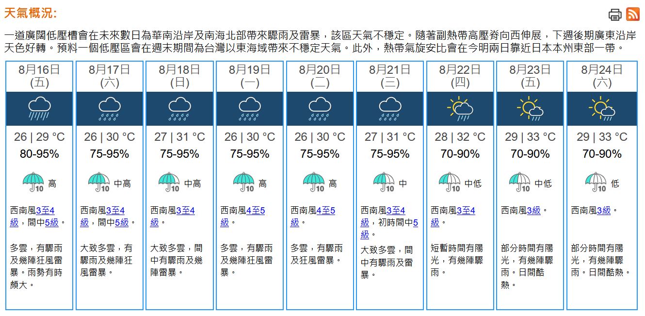 【08:42】上午8時30分,天文台錄得29.5°C,相對濕度84%。一道廣闊低壓槽正為華南沿岸及南海北部帶來驟雨及雷暴。本港地區今日(15日)天氣預測大致多雲,間中有驟雨及幾陣狂風雷暴。早上短暫時間有陽光,最高氣溫約31°C。吹輕微至和緩西南風。展望未來一兩日間中有驟雨及雷暴,周五(16日)雨勢有時頗大。(天文台)