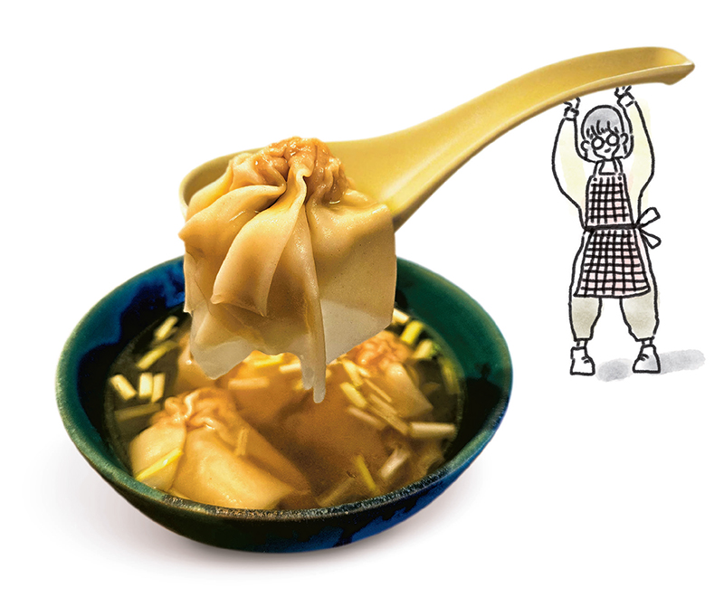 舀起一粒雲吞,長長的鹼水皮散尾垂落,掛滿蝦湯。吮入口中,雲吞皮又爽又滑又鮮,咬下彈牙的肉餡,蝦的爽甜和肉的鹹香於咀嚼間爆發。小時候不懂什麼雅致高級的享受,只覺得雲吞跟平日的家常便飯與別不同,是特別讓人興奮期待的美食。我家做雲吞,一斤皮包上百粒,一餐就被我姊妹倆吃光了。