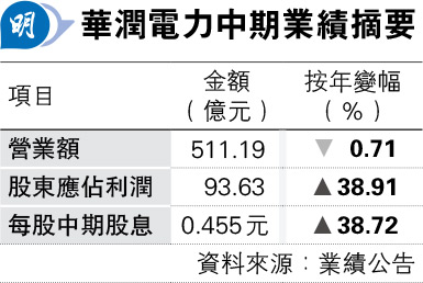 【明報專訊】華潤電力(0836)昨日公布6月底止中期業績,股東應佔淨利潤按年增長38.9%,賺93.63億元。當中火電業務核心淨利潤按年大增2.74倍至27.15億元;可再生能源業務核心淨利潤按年減少6.69%至55.56億元。每股派中期息0.455元,按年增加38.72%。