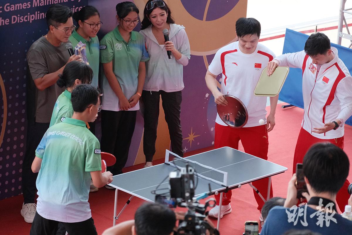 部分運動員其後上台與青年分享心得,首先登場是女子20公里競走金牌得主楊家玉,她向保安局青少年代表展示競步技術動作,並向青年的動作給予分數,又送上簽名T恤。其後不同項目代表參與交流,包括拳擊隊、乒乓球隊及游泳隊。拳擊隊的吳瑜、常園及李倩現場教小代表打拳;乒乓球隊馬龍、樊振東則用鑊蓋、鑊鏟作球拍,與小代表在「縮水」球檯上切磋。游泳隊潘展樂則被問及對「飛魚」稱號的看法,他回應稱「我覺得我就是我自己吧,這個『飛魚』可以留給下一個游得快的人」。