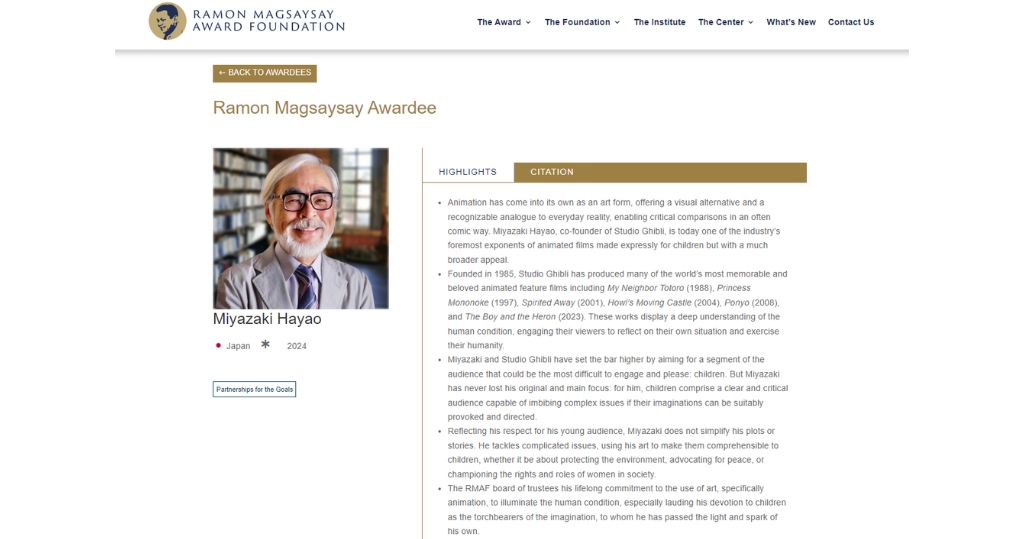 主辦單位表示,宮崎駿獲獎是表揚他「提倡保護環境與和平,並利用藝術令這些複雜議題容易被孩子所明白,以娛樂作教育」。今年得獎者尚有3名個人和一個團體,來自越南、印尼、不丹和泰國,分別在經濟援助、教育、醫療、環保等範疇有突出成就。頒獎禮將於11月16日在馬尼拉舉行。(NHK/Ramon Magsaysay Award/中央社)