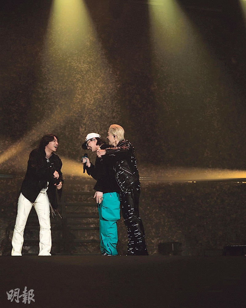前晚尾場,原本坐在觀眾席睇騷的G-Dragon(GD)也驚喜登台,三子久違同台,合唱BigBang經典歌《Bang Bang Bang》、《Fantastic Baby》及《We like 2 Party》;太陽與GD更合唱《Bad Boy》,掀起全晚高潮。據悉太陽早前參與大聲的粉絲見面會,後者今次算是「回禮」。前晚演唱會開始前,太陽與大聲跟GD說:「想上台就來吧!」BigBang才有「重組」機會。GD表示沒想過要上台,但太陽與大聲兩晚同台演出,如果他不上台,就會變「衰仔」。另外,韓媒報道指GD有望今年12月推出新碟;太陽則落實10月5日來港開騷,門票今日(3日)起公開發售。