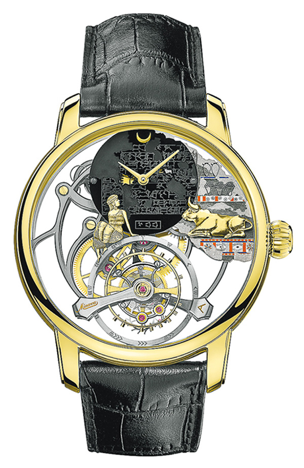 品牌與日內瓦大學古代科學系美索不達米亞研究教授Catherine Mittermayer聯手創作這枚18K金腕表,縞瑪瑙表盤上鐫刻了安海度亞娜創作的《神廟讚美詩》(Temple Hymns)詩文。腕表上沒有品牌標誌,而是以蘇美語中代表「白色」和「山」的符號標示。黃金鐫刻而成的安海度亞娜優雅地坐在外置陀飛輪上方,因為她是月神的大祭司,因此12時位置飾有新月;月亮讓人想起公牛的角,故公牛也是月神的常見象徵,表盤3時位置便飾有一頭公牛,下方的秒針刻度環上則蝕刻了1至12的蘇美語數字。●