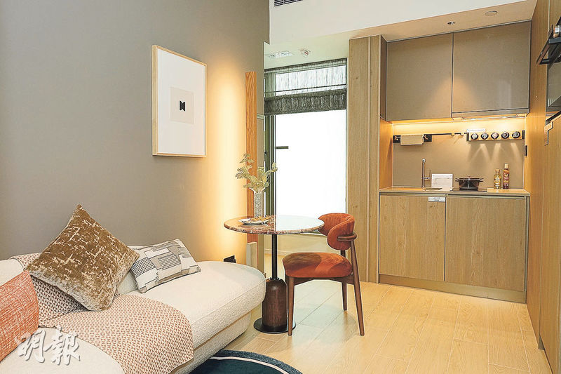 值得留意的是,2樓設有連平台特色單位,其中3伙的平台面積,皆大於單位內籠;以2樓D室為例,屬實用面積248方呎一房戶型,連872方呎平台,即平台面積約相等於單位內籠的2.5倍。發展商提供兩個示範單位,其中25樓D室,實用面積270方呎一房間隔,入口玄關一側以偌大玻璃窗採光,設置鞋櫃及層架,客廳以深灰色佈置牆身,配上米白色梳化及雲石圓桌,打造低調溫馨氛圍。