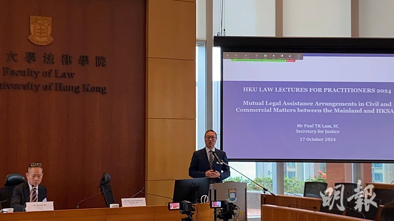 律政司長林定國在港大法律學院一個講座表示,香港在一國兩制下實行普通法,與內地法制完全不同,但兩種法制不代表並無聯繫,反而為了香港及整個國家利益,兩種法制應有恰當的聯繫。