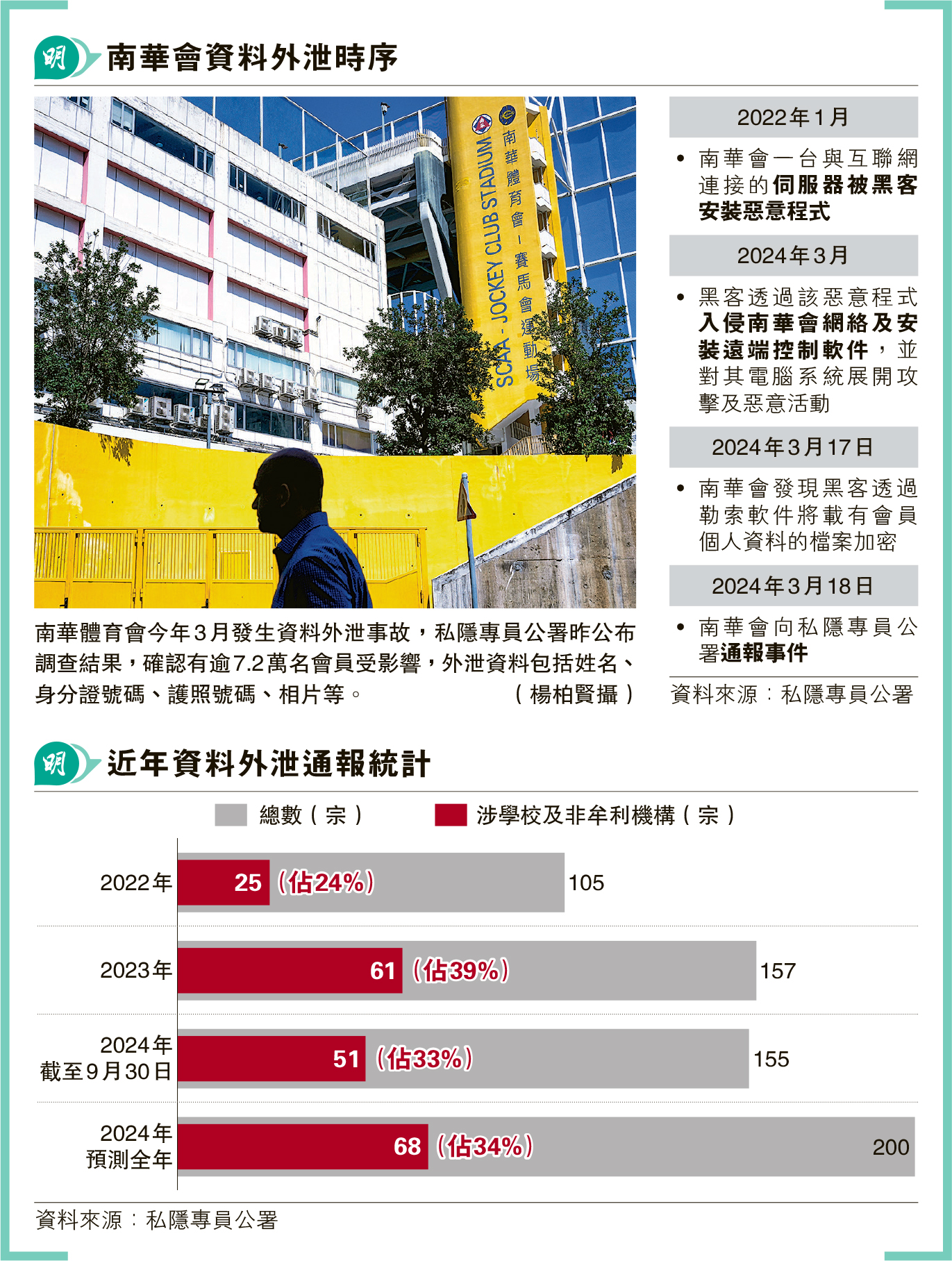 【明報專訊】南華體育會今年3月發生資料外泄事故,逾7.2萬名會員受影響。私隱專員公署昨公布調查結果,發現早於事發兩年前已有黑客潛伏於南華會伺服器,但偵測措施未能識別,直至黑客攻擊及入侵。公署指黑客潛伏時間雖較長,但認為會方若有採取所有切實可行步驟,有機會避免事故,裁定違反私隱條例,已送達執行通知。私隱署亦發現近兩年涉及學校及非牟利機構的外泄事故趨升,均佔整體資料外泄事故逾三成,提醒機構加強資訊安全措施(見另稿)。