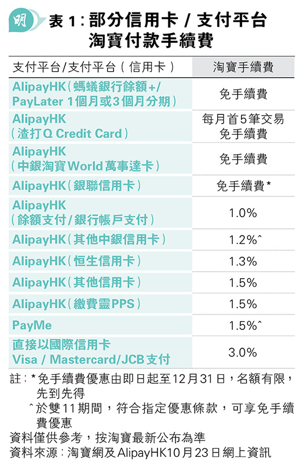 除了優惠折扣外,淘寶香港最近推出包郵到港活動,購買指定商品滿99元,自提可免跨境段運費。要獲取此優惠,需於淘寶手機應用程式(App)的中國香港站,選購有標示「HK¥99包郵」標識的商品,實際付款金額滿99元或以上,收貨地址需位於香港,跨境段運輸方式需選擇「官方直運」或「官方集運」,且取貨方式需選擇「自提」。是次淘寶「雙11」不止郵費,連淘寶手續費也有機會省卻,過去要免淘寶手續費需使用指定信用卡或銀行帳戶(見表1)透過AlipayHK於淘寶付款,如中銀淘寶World萬事達卡,便是其中之一,惟最近不少信用卡或支付平台與淘寶合作推出限時免淘寶手續費優惠,如中銀信用卡、銀聯、AlipayHK及PayMe等推出的限時免淘寶手續費優惠,均可覆蓋是次淘寶「雙11」的兩個階段(見表2)。
