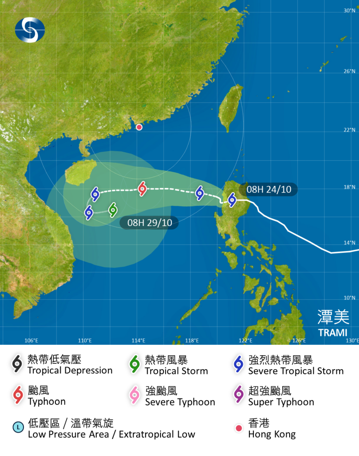 上午8時,強烈熱帶風暴潭美集結在馬尼拉以北約300公里,預料向西移動,時速約10公里,橫過呂宋。天文台預測,潭美會在今晚至周五早上進入本港800公里範圍,天文台屆時會發出一號戒備信號。