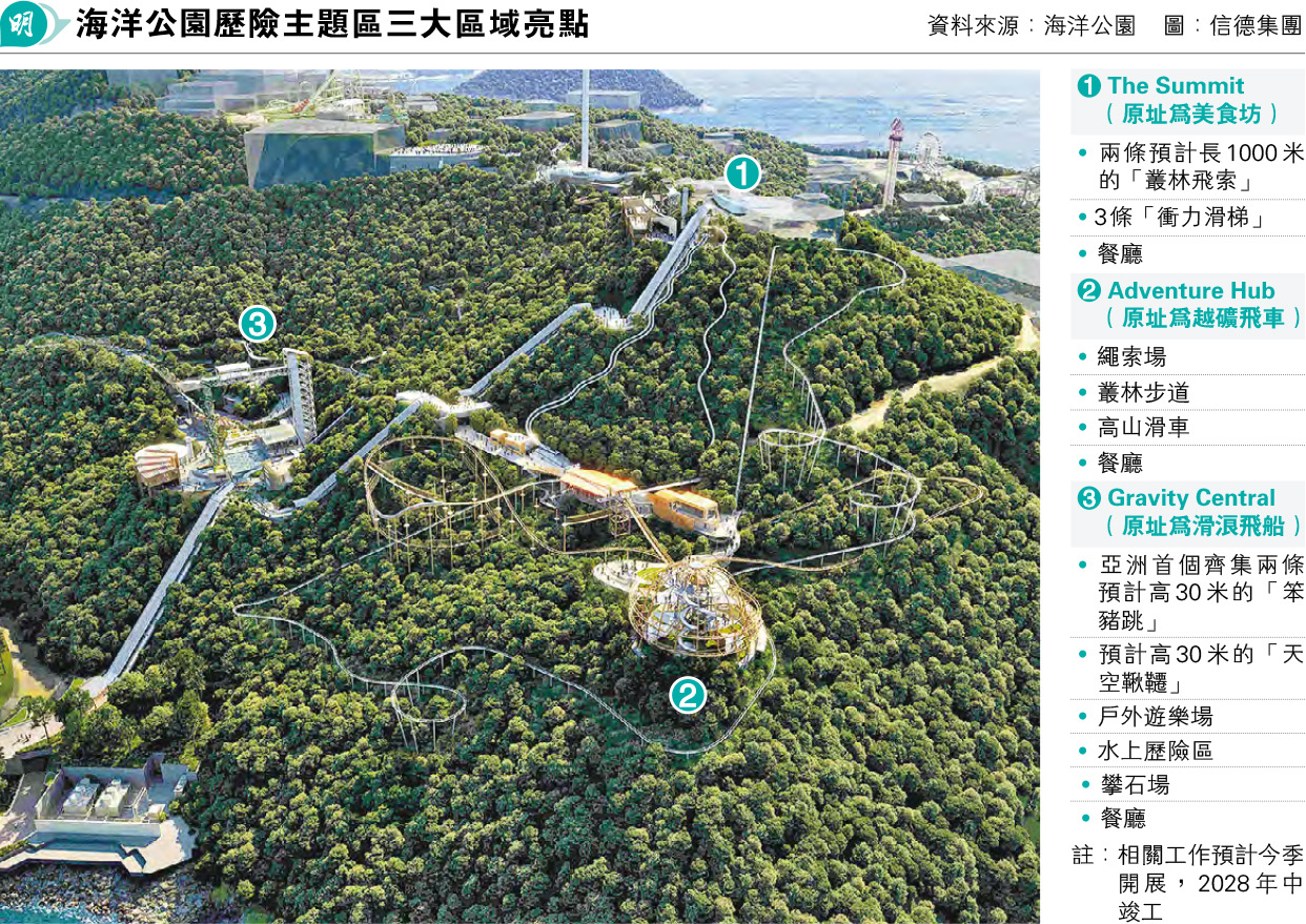 【明報專訊】海洋公園2021年提出的「重生方案」終見曙光,重生方案之一的「歷險主題區」將由兩個集團合組財團發展,設3個擬訂區域,主題區將設亞洲首個齊集兩條預計高30米的「笨豬跳」,以及兩條各長1000米的「叢林飛索」等,預計今季內開展工程,2028年中竣工並開放予公眾,入場需另外購票。海洋公園行政總裁黃嗣輝說,售價待開幕公布。