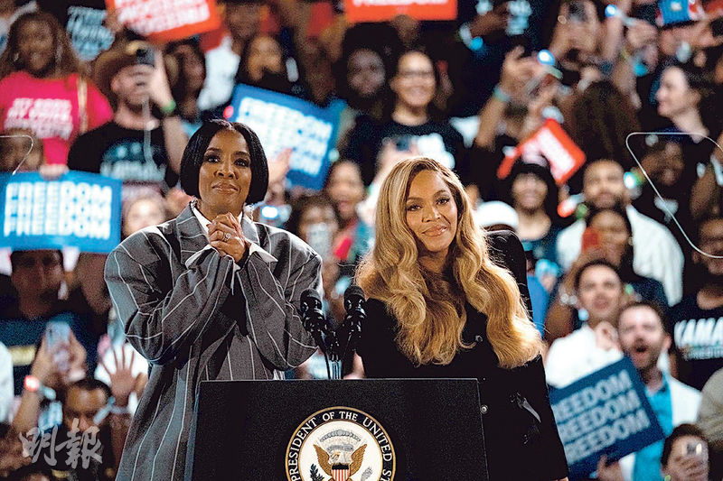 【明報專訊】美國總統大選下月5日舉行,荷李活演藝界連日不少人為民主黨總統候選人賀錦麗(Kamala Harris)站台,前日除了《罪惡城》女星謝茜嘉艾芭(Jessica Alba)出席得州休斯敦的造勢大會之外,樂壇天后Beyonce亦跟Destiny’s Child隊友Kelly Rowland一起登場。Beyonce表示,大家正處於巨大轉變的邊緣,「我在此並非以名人身分,也不是政客,而是一名母親,關心小孩身處什麽樣的世界,能否有自由控制自己的身體,這世界是否沒有分裂」,Beyonce並呼籲民衆投票給賀錦麗。鄉謠歌手Willie Nelson則為這次造勢大會演出。