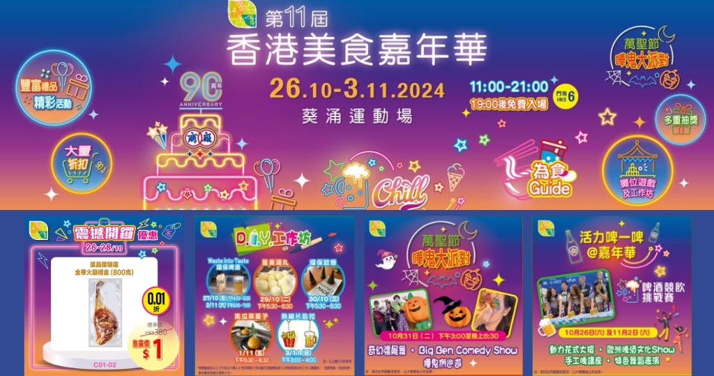 香港美食嘉年華已在網頁公布,今(27日)11時起至11月3日在葵涌運動場舉行,活動設有逾300個戶外攤位,其中有50個熟食攤位,供市民嘗盡街頭小食。5大展區包括:「健康養生區」、「休閒食品區」、「餐飲用具區」、「為食Guide」,以及新增主題展區「Chill飲Chill食」,售賣各式酒品及小食,每晚6時免費派發100杯啤酒。活動期間,主辦單位更聯同「金茶王」送出8000支限量版熊貓奶茶。場內售賣大量低於一折的產品,亦有1元超抵貨品。每日首90名入場者更可獲贈福袋(價值160元)。