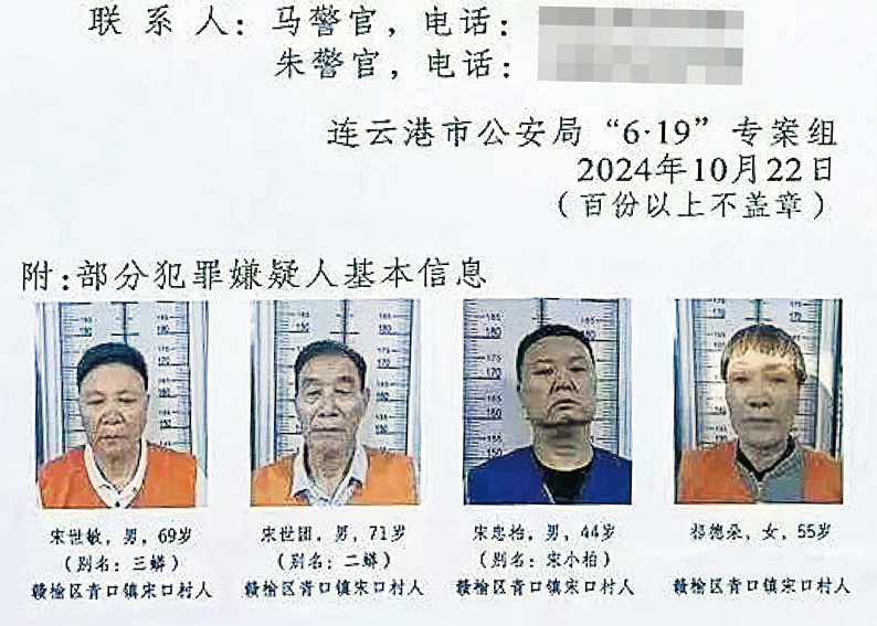 連雲港市公安局成立「6·19」專案調查組,在贛榆各地街頭張貼公告,上附4名疑犯資料,均為贛榆區青口鎮宋口村人,依次是69歲的「三蟒」宋世敏、71歲的「二蟒」宋世團、44歲的宋忠柏和55歲的祁德朵。