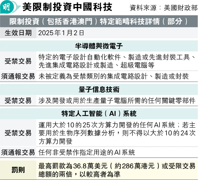 科技創新界議員邱達根回覆本報,形容美國的相關公布屬意料之中,過去一兩年在規定醞釀期間,已少見香港AI相關項目有美國基金投資,而最新的《施政報告》提出由特區政府成立「創科產業引導基金」,以引導更多來自各地的投資者投資香港創科,屬完全合適時間。