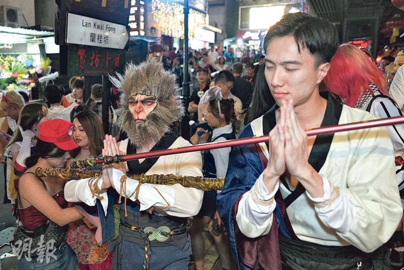 【明報專訊】每年萬聖節,中環蘭桂坊都會成為「嘩鬼」集中地。萬聖節前夕的萬聖夜,大批市民及遊客昨晚扮鬼扮馬湧到蘭桂坊,氣氛愈夜愈熾烈,有趁熱鬧市民稱今年人流比去年多兩三倍。有內地學生亦參與盛會,認為香港節慶氣氛較濃烈和開放,「這裏的萬聖節讓我能盡情表現自己」。香港酒吧業協會主席錢雋永稱,今年萬聖節市道較去年旺,預料生意額增近一成。
