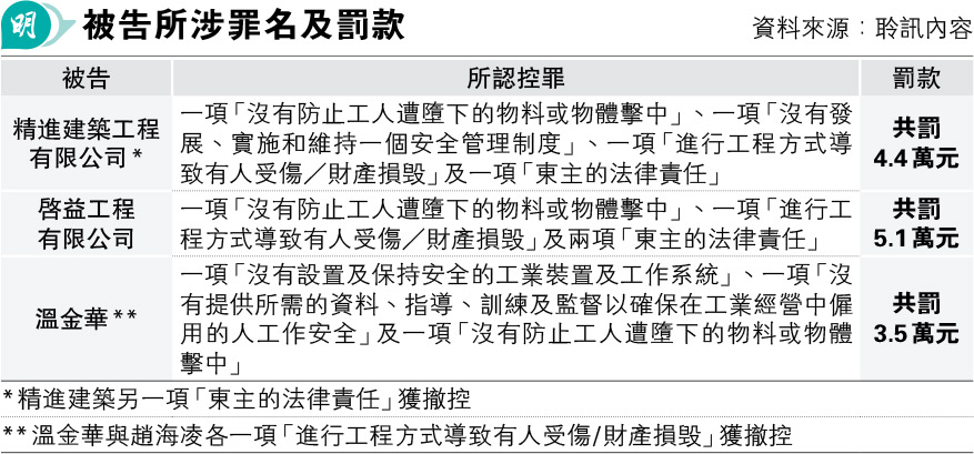 精進建築工程有限公司及啟益工程有限公司昨日分別承認4項傳票罪,溫金華承認3項傳票罪,趙海凌則獲撤銷控罪(見表)。勞工處傳票的案情指稱,2022年7月5日起精進建築工程是油塘東源街8號地盤的一般建築承建商,負責興建住宅、樓宇及會所等設施,該項目工程總額8.97億元。
