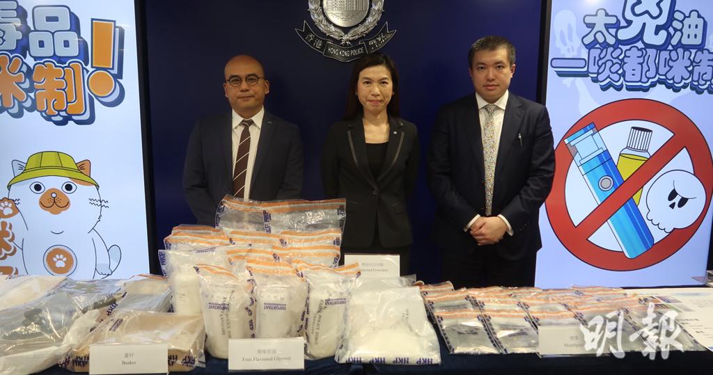 毒品調查科(行動)署理警司湛耀光表示,毒販將「依托咪酯」粉末混入帶有不同香味的甘油,經加熱加工,形成液態依托咪酯,即俗稱「太空油」,再注射入煙彈出售。湛耀光表示,涉事工場約營運一個月,環境簡陋,形容「土法製造」的太空油份量有機會致命,相信此批太空油未完全流出市面。他稱,截至2024年9月30日,本港有60宗牽涉「太空油」案件,共檢取2800多克,但本案已涉及1300多克「依托咪酯」,屬近期較大宗相關案件。被捕姓鄧男子稍後將被暫控「管有第一部毒藥」,明日在西九龍裁判法院提堂。