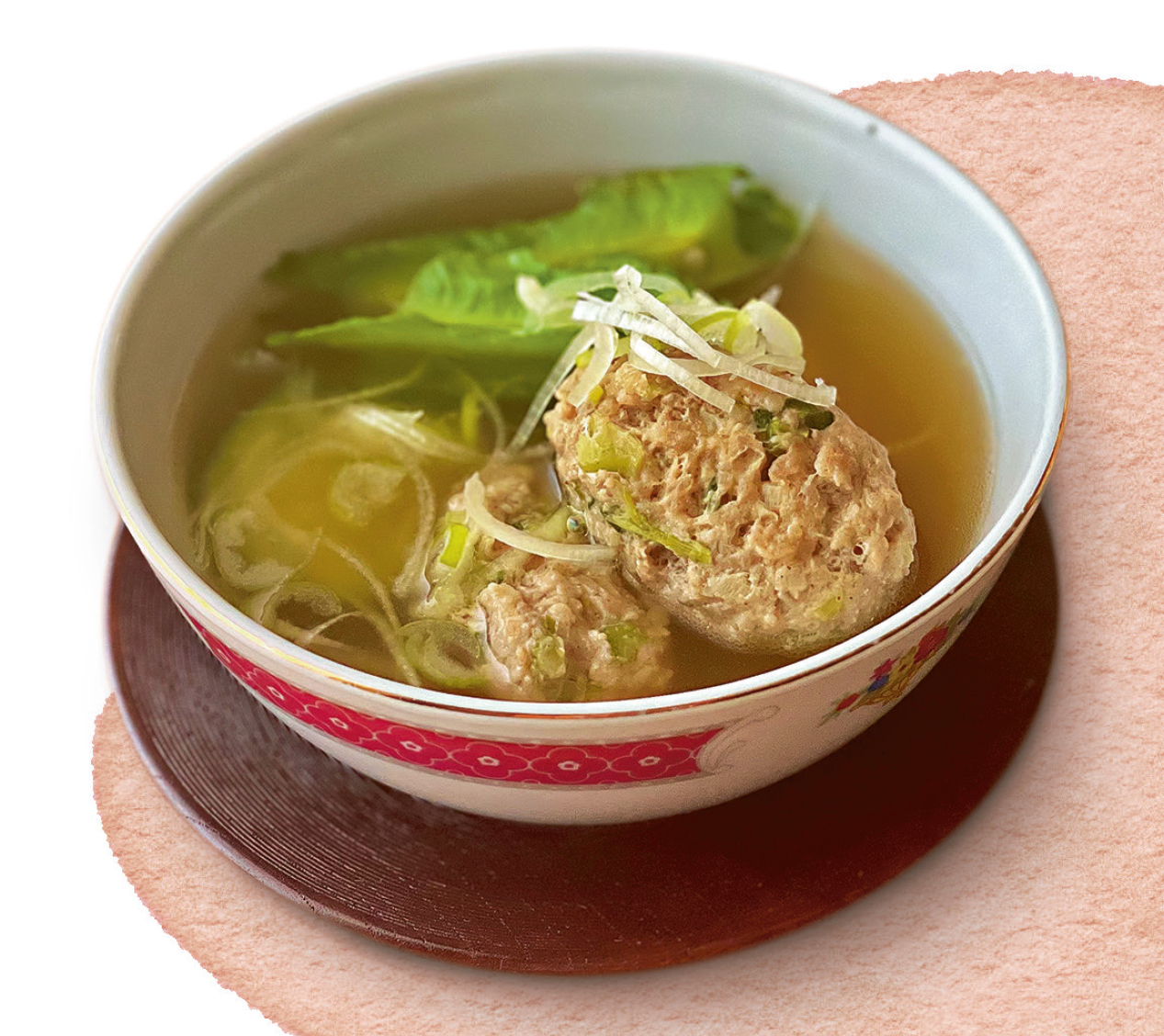 高湯煮滾後收小火,加入生薑絲和海鹽,肉丸輕輕放入高湯中,蓋上鍋蓋煮20分鐘,其間撇走表面雜質。加入蔬菜煮至熟透。上菜前撒上葱花,完成。