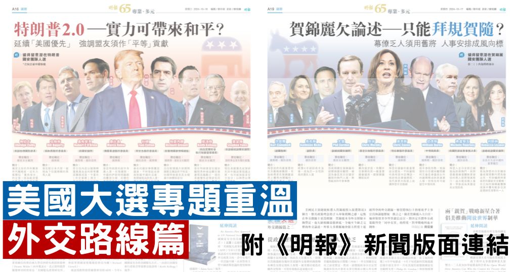 《明報》國際組一連兩期各自介紹共和黨總統候選人特朗普和民主黨總統候選人賀錦麗的外交和國防理念,以及二人的重要幕僚及其潛在的國安高官人選。