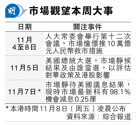 【明報專訊】美國總統將於周二進行選舉,加上由昨日起至本周五,人大常委會舉行第十二次會議,以及市場觀望美聯儲本周四議息結果(見表),連串重磅消息結果待決,港股市場表現觀望,無論波幅及成交均見縮減。恒生指數全日收報20,567點,升61點,波幅收窄至187點,創近7周以來最低。全日成交額縮至1162.33億元,為9月中以來最低。