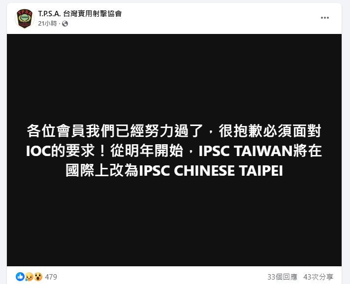 國際實用射擊聯盟台灣區總監陳信宏5日表示,國際奧委會要求明年起台灣實用射擊協會(IPSC Taiwan)國際上將改為IPSC Chinese Taipei,也無法使用青天白日滿地紅旗,屆時只能出現中華奧委會的會旗。