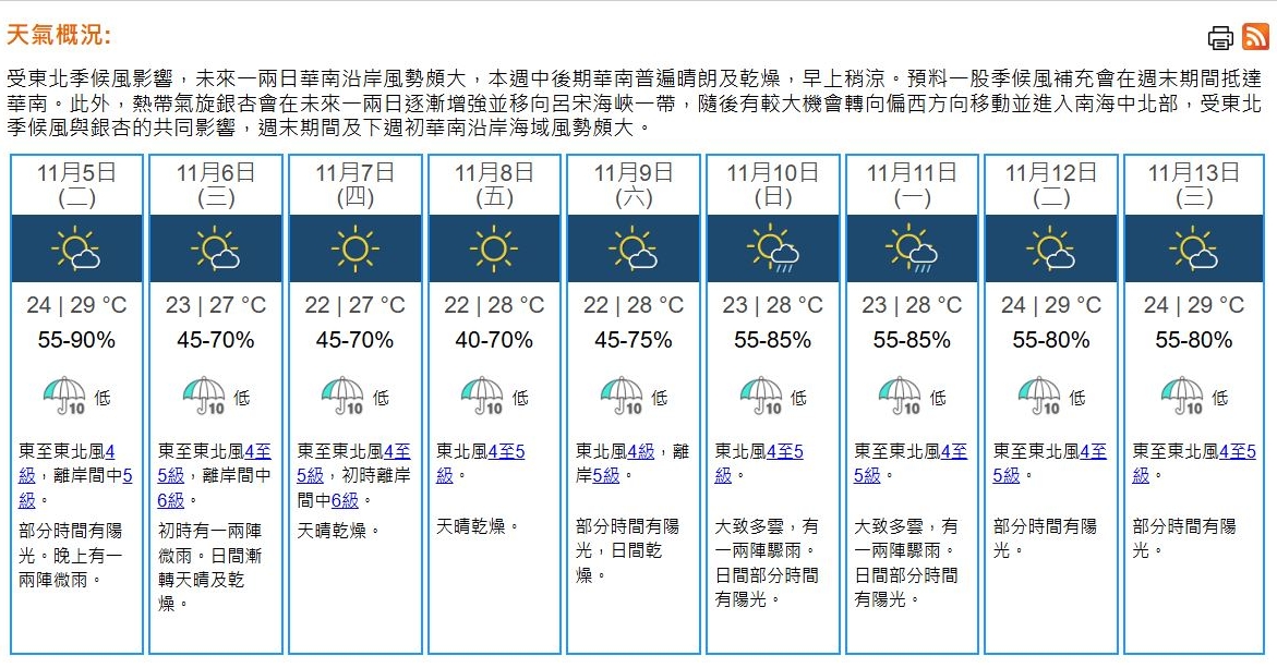 即時熱點 天氣|天文台:最高約29°C 晚上有一兩陣微雨 (09:12) 發佈於 1 年 前 2024 年 11 月 5 日 By 明報 早上8時50分,天文台錄得氣溫25.1°C,相對濕度64%。 東北季候風正影響廣東沿岸。上午8時,強烈熱帶風暴銀杏集結在馬尼拉之東北偏東約750公里,預料向西北移動,時速約25公里,移向呂宋海峽一帶並逐漸增強。 本港今日(5日)部分時間有陽光,最高氣溫約29°C。晚上有一兩陣微雨。吹和緩東至東北風,離岸風勢間中清勁。展望未來兩三日大致天晴及乾燥,早上稍涼。(天文台) 相關文章:天文台天氣天氣速遞編輯推介 Up Next 短片:泰國侏儒河馬「預測」美大選特朗普勝 (18:24) 不要錯過 英國明年起加大學學費 時隔8年來首次調整 (12:08) 繼續閱讀 贊助商 猜你喜歡 天氣|天文台:周日早上市區最低14℃ 部分地區寒冷 (17:55) 天氣|天文台:多雲有幾陣雨 今晚轉涼降至約17℃ (09:25) 【Emily】天文台「矚目天氣及氣候事件選舉」 投票有機會獲紀念品 天氣|天文台:周六多雲有雨 晚上轉涼氣溫17至21°C 下周日跌至最低14°C (21:22) 天氣|天文台:短暫時間有陽光 最高19°C (08:24) 天氣|天文台:周四多雲早晚有微雨 氣溫介乎17至20°C (20:57)