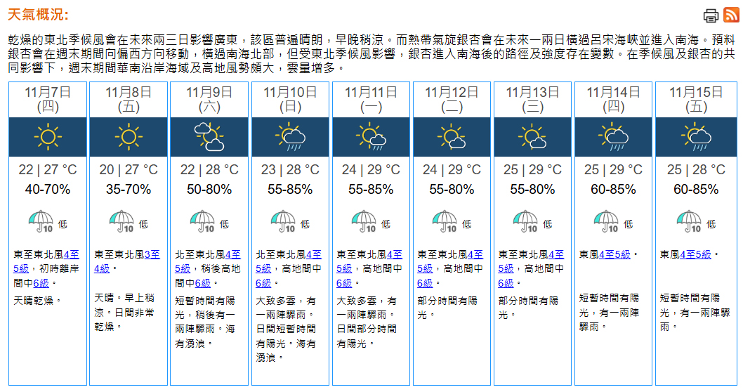 即時熱點 天氣|天文台:周四料22°C-27°C 天晴乾燥 離岸間中吹強風 (20:50) 發佈於 1 年 前 2024 年 11 月 6 日 By 明報 本港地區今晚(6日)及明日(7日)天氣預測:天晴乾燥,明早稍涼,市區最低氣溫約22°C,新界再低兩三度,日間最高氣溫約27°C。吹和緩至清勁東至東北風,明日初時離岸間中吹強風。展望周五早上仍然稍涼,最低氣溫在20°C左右,日間非常乾燥。周末期間雲量增多,海有湧浪。[天文台:銀杏周四晚至周五進入本港800公里範圍] 晚上8時,強颱風「銀杏」集結在馬尼拉之東北約520公里,預料向西北偏西移動,時速約12公里,移向呂宋海峽一帶。(天文台) 相關文章:天文台天氣速遞編輯推介 Up Next 美國大選.短片|特朗普支持者興奮睇開票 賀錦麗粉絲沮喪離場 (17:20) 不要錯過 富士山頂現積雪 待官方確認「初冠雪」 (20:23) 繼續閱讀 贊助商 猜你喜歡 天氣|天文台:周日早上市區最低14℃ 部分地區寒冷 (17:55) 天氣|天文台:多雲有幾陣雨 今晚轉涼降至約17℃ (09:25) 【Emily】天文台「矚目天氣及氣候事件選舉」 投票有機會獲紀念品 天氣|天文台:周六多雲有雨 晚上轉涼氣溫17至21°C 下周日跌至最低14°C (21:22) 天氣|天文台:短暫時間有陽光 最高19°C (08:24) 天氣|天文台:周四多雲早晚有微雨 氣溫介乎17至20°C (20:57)