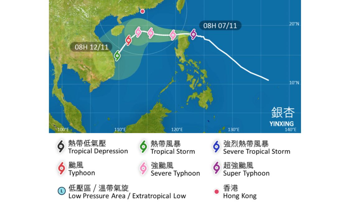 上午8時,超強颱風銀杏集結在馬尼拉之東北偏北約500公里,預料向西移動,時速約12公里,移向呂宋海峽一帶。根據現時預測,銀杏會在今晚至明早進入本港800公里範圍,並採取偏西方向移動,橫過南海北部。受東北季候風影響,銀杏進入南海後的路徑及強度存在變數。雖然銀杏的環流較為細小,但在東北季候風及銀杏的共同影響下,周末期間華南沿岸海域及高地風勢頗大。天文台會視乎銀杏與珠江口的距離、其強度轉變、以及本地的風力變化,評估是否需要在周五稍後至周六(9日)初時發出一號戒備信號。(天文台)