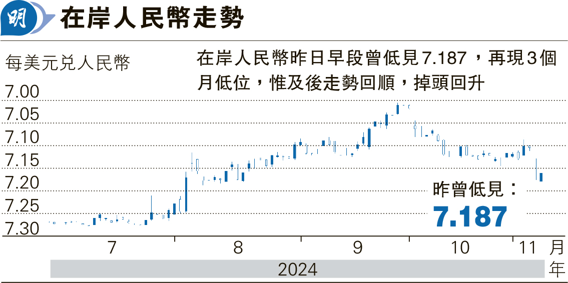 【明報專訊】美國共和黨很大機會同時控制白宮與參眾兩院,拖累周三離岸人民幣急挫逾千點子(1元等於1萬點子)後,昨日美元回吐失守105點,助人民幣企穩。昨日人民幣中間價下調666點子,離岸人民幣在早段曾進一步貶至7.21水平,及後止跌回穩,至下午升勢擴大,截至晚上7時半報7.1748,上升305點子,在岸人民幣報7.1627,升155點子。在岸人民幣亦先跌後升。
