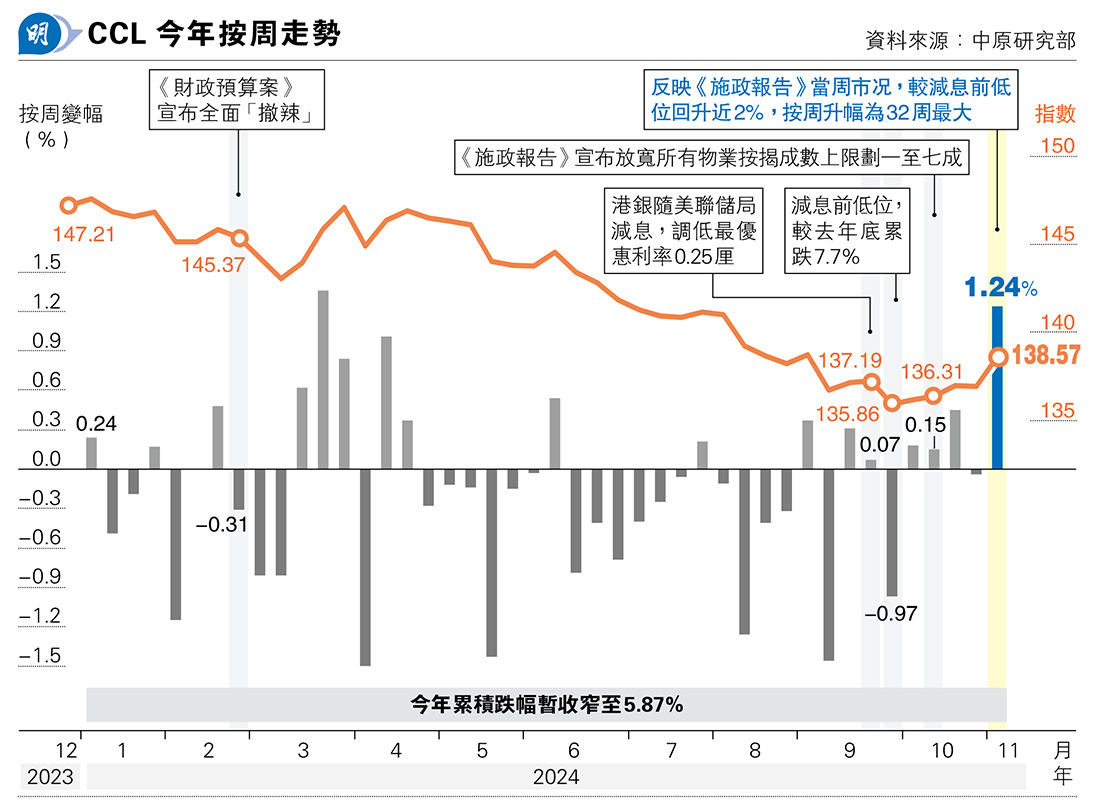 施政報告當周CCL彈1.2% 8個月最勁 較9月減息前低位升2% 今年跌幅收窄至5.87%