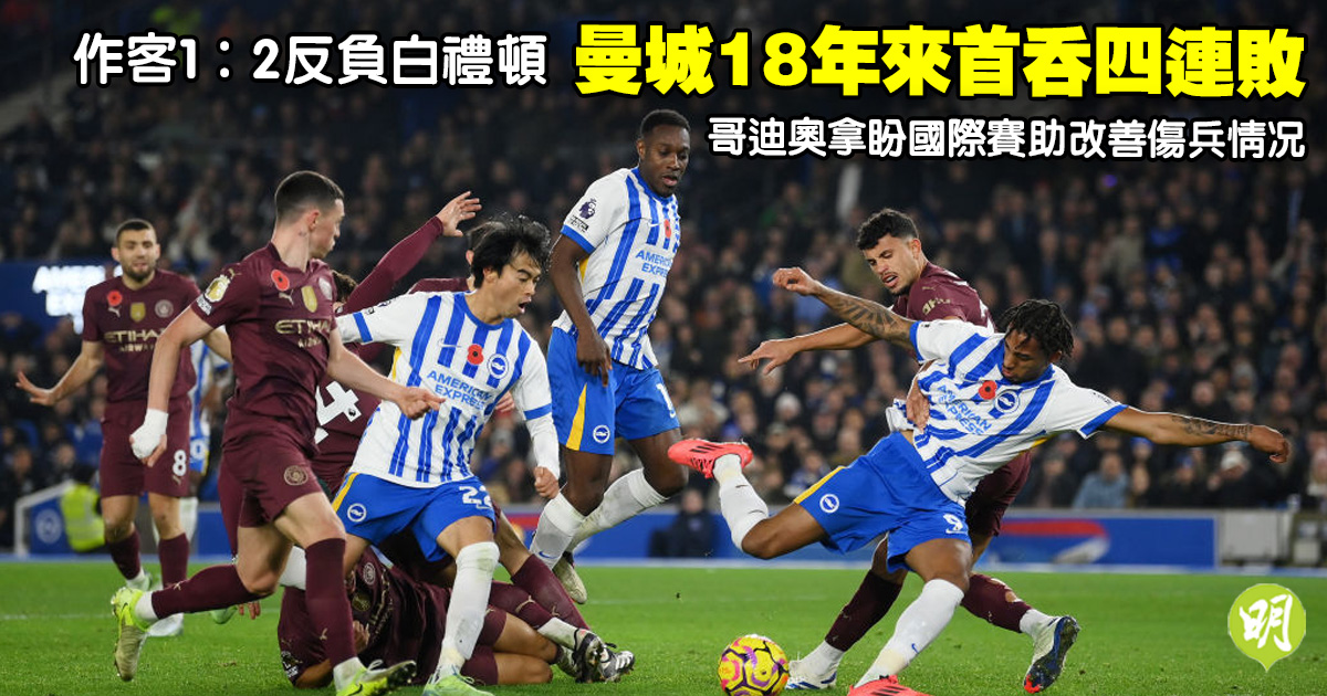 曼城欲成英超五連霸今晨(10日)再受沉重打擊!他們作客以1:2反負白禮頓,賽後雖11戰得23分續排次席,但已被主場以2:0輕取阿士東維拉的一哥利物浦拉開至5分。「藍月」各賽事11天內錄得四連敗,乃主帥哥迪奧拿領軍以來及球隊近18年來首次,但他稱「一生中總會發生一次」,並期望接着的國際賽檔期能改善隊內的傷兵滿營情况。