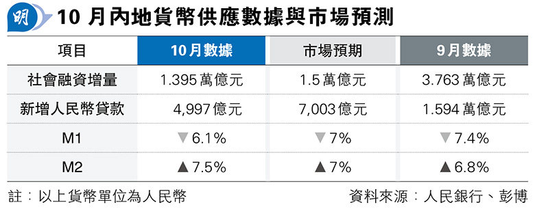 【明報專訊】人民銀行昨日公布最新數據顯示,10月份的社會融資規模及新增人民幣貸款,分別為1.4萬億元(人民幣,下同)及4997億元,相對市場預期的1.5萬億元及7000億元為低。月內新增的人民幣貸款水平,更為過去3個月最低水平。