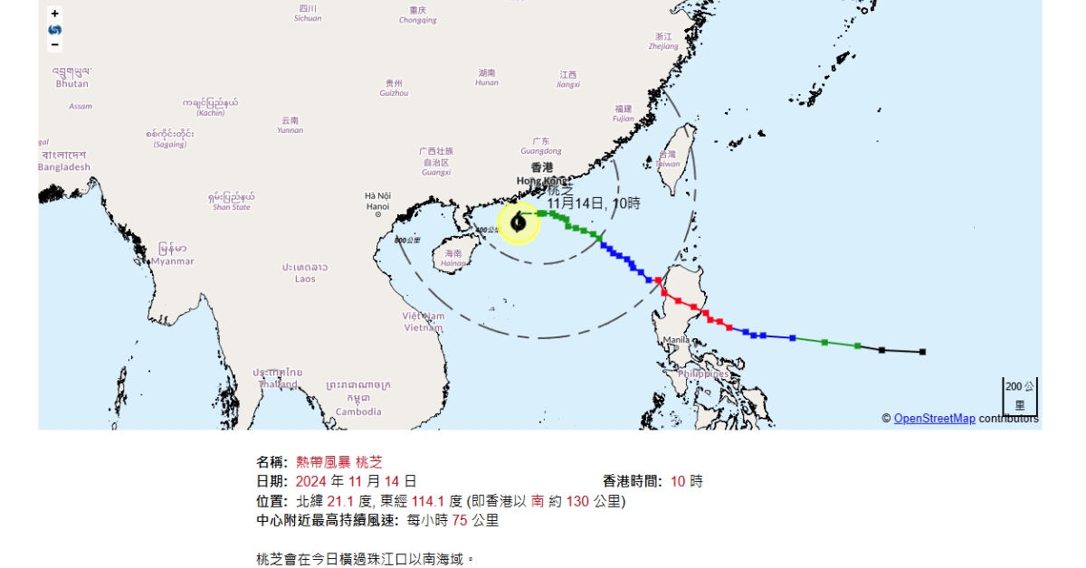 【10:40】天文台於上午10時20分改發三號強風信號,預料本港平均風速每小時41至62公里。桃芝繼續減弱,預料本地風力會逐漸緩和,但初時仍然普遍吹強風,離岸及高地間中吹烈風。三號強風信號將會在今日(14日)日間大部分時間維持。當桃芝對本港的威脅進一步減低時,天文台會改發一號戒備信號或取消所有熱帶氣旋警告信號。