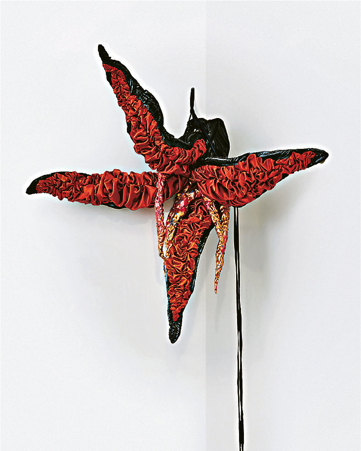 通過藝術,將個人遭受的情感暴力、宗教中的人際暴力與更廣闊的「暴力美學」相連接,不禁令人想起上世紀女權主義運動的口號:「個人的即政治的(The personal is political)」,鼓勵人們從政治的角度肯定和擁抱個人經歷。展廳一角的牆上,懸着一朵綻放的紅色布製花苞,似血盆大口,又似女性生殖器——這是韓國藝術家禹漢娜的作品《上竣》(Agari),展品的英文名在日語中有「上升」之意。Cusson解說,在韓國東大門,有許多女性勞工。藝術家從東大門購買布料,將柔軟的布製成極具視覺衝擊力的「雕塑」,希望令觀眾察覺存在於女性身邊的、難以察覺卻對身體造成傷害的暴力。