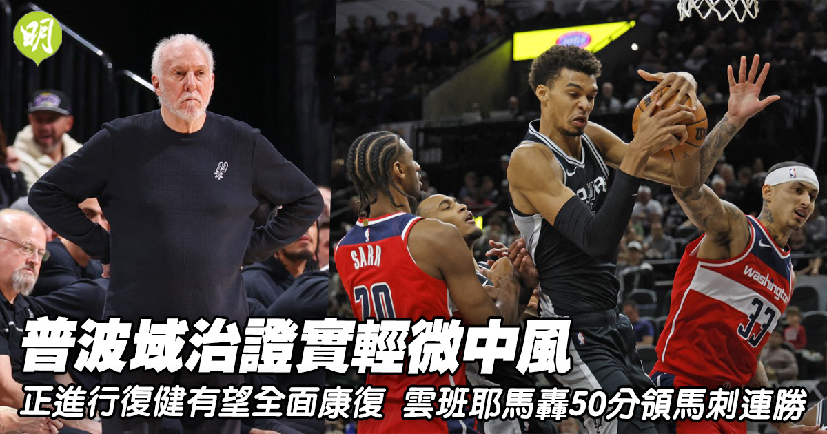 聖安東尼奧馬刺今晨(14日)公布,早前突然缺席多場賽事領軍的主帥普波域治,因在11月2日輕微中風入院,目前已進行復健療程,有望全面康復,但歸期未定。至於馬刺新星雲班耶馬今早在NBA常規賽獨取個人單場新高50分,領銜主場以139:130擊退華盛頓巫師。
