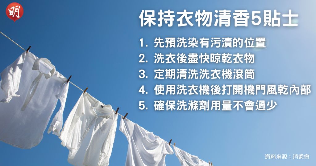不少人為了令衣物更清香,洗衣時都會加入衣物清香珠。惟消委會表示,大部分衣物清香珠含有多種香料致敏物質,並引述澳洲消費者組織指出,有強烈香味的家居產品(包括:洗衣劑和衣物清香珠)或會導致過敏,甚至出現紅疹。消委會提醒應避免長期大量使用衣物清香珠或使用過於頻密,並提供保持衣物清香5貼士。