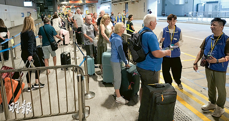 本報記者昨晨6時許到啟德郵輪碼頭觀察,船上旅客約7時起陸續步出抵港大堂,大多選搭的士離開,僅小部分旅客到巴士站候車,當時亦只有零星的士駛入,的士站人龍湧現,其間政府曾呼籲的士司機駛入郵輪碼頭,碼頭亦加碼向的士司機派100元石油氣券;至9時後駛入碼頭的士漸多,逐步消化候車人龍,10時半旅客完全散去。旅客候車期間,旅遊事務署人員及郵輪碼頭董事總經理班智榮亦在場了解。